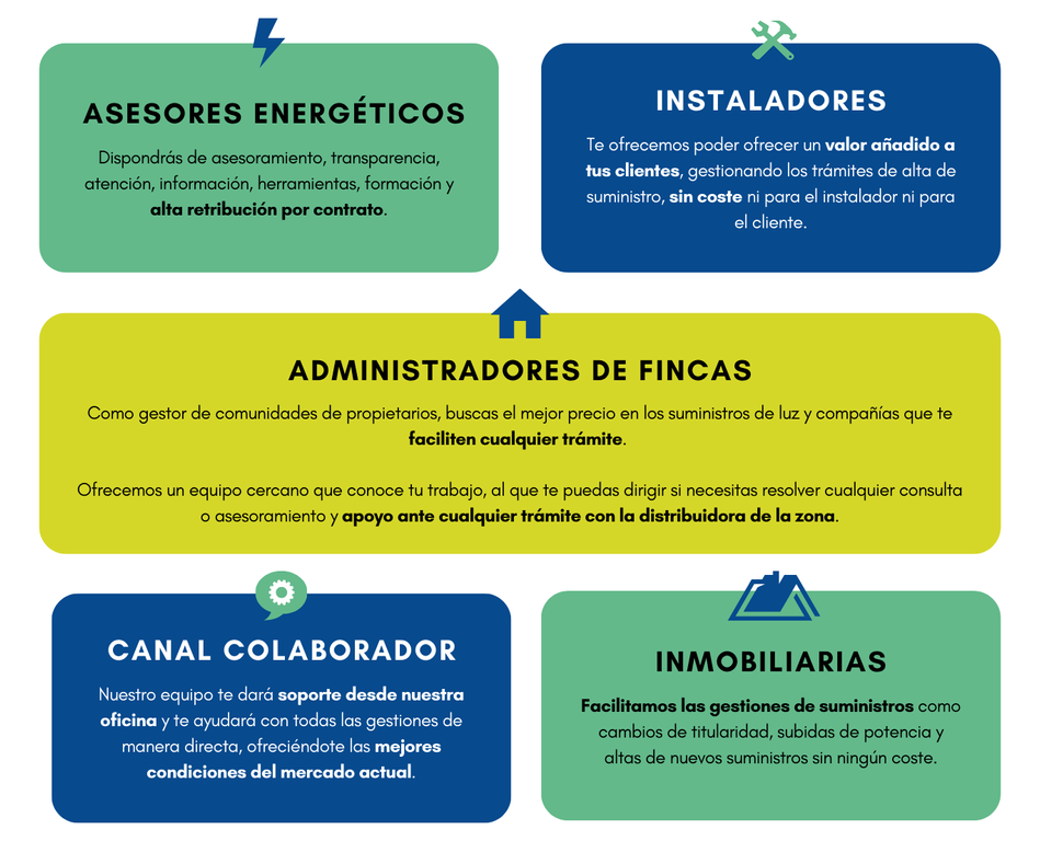 Creemos en la cooperación como base de crecimiento, y lo hacemos con diversos tipos de colaboradores a nivel nacional; ya sean asesores energéticos, empresas afines de eficiencia energética, ingenierías, asesorías empresariales, inmobiliarias, administradores de fincas, instaladores, etc.